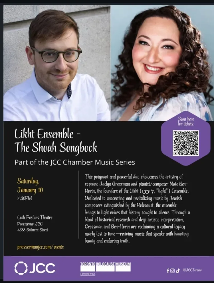 Before they founded The Likht (ליכט, “light”) Ensemble, pianist Nate Ben-Horin and Soprano Jaclyn Grossman “had no idea there was a musical world in the Holocaust.” Since 2020, the piano-vocal duo has made it their mission to uncover and share previously lost repertoire by Jewish composers from the Holocaust.